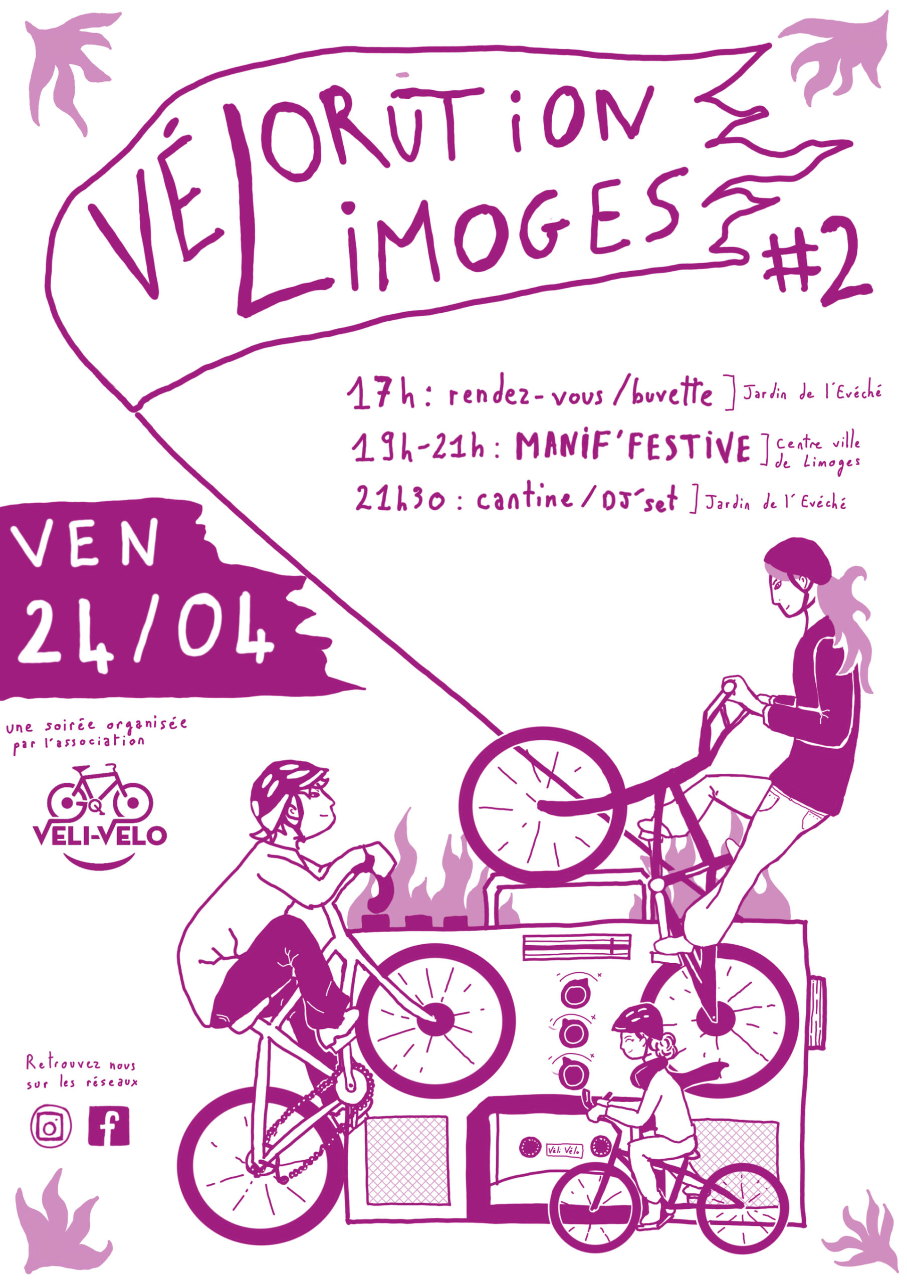 – 19h – 21h : manif’ festive à vélo ( 10km / 2h / dj’set inclus) // dans Limoges avec pause à mi-parcours sur la Place de la République